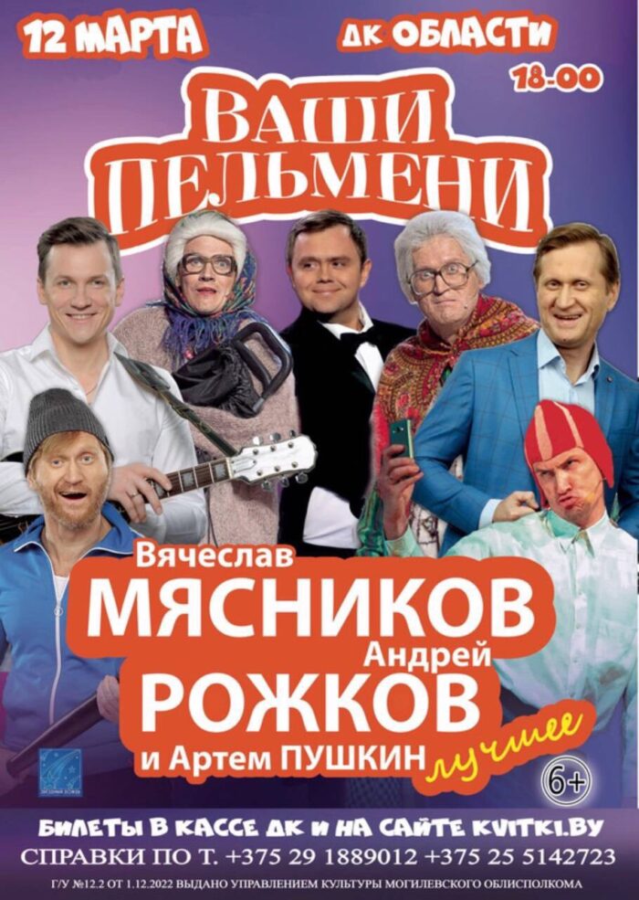 Самые яркие участники шоу «Уральские пельмени» — Вячеслав Мясников, Андрей Рожков и Артем Пушкин — выступят в Могилеве 12 марта. На сцене Дворца культуры области артисты представят свою новую программу — юмористическое шоу «ВАШИ пельмени».