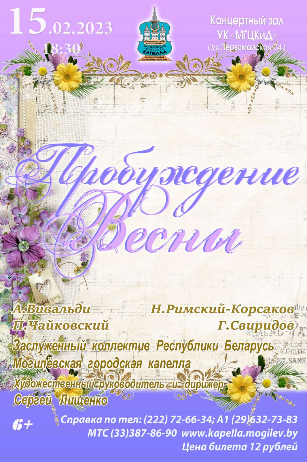 Программу «Пробуждение весны» представит 15 февраля Могилевская городская капелла. Заслуженный коллектив Республики Беларусь исполнит произведения А. Вивальди, П. Чайковского, Н. Римского-Корсакова, Г. Свиридова.