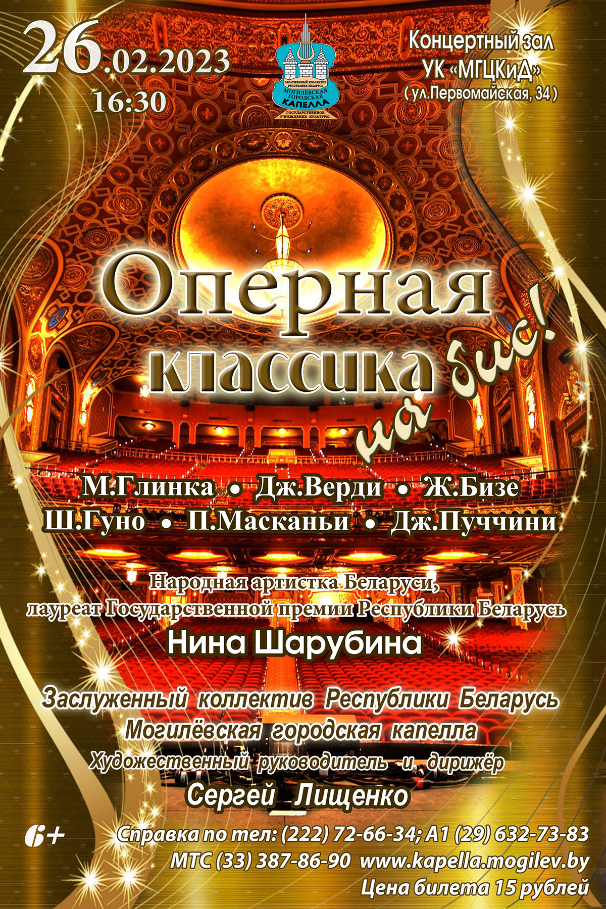 Концертную программу «Оперная классика на бис!» представят в Могилеве заслуженный коллектив Республики Беларусь Могилевская городская капелла под руководством Сергея Лищенко и Народная артистка Беларуси, лауреат Государственной премии Республики Беларусь Нина Шарубина.