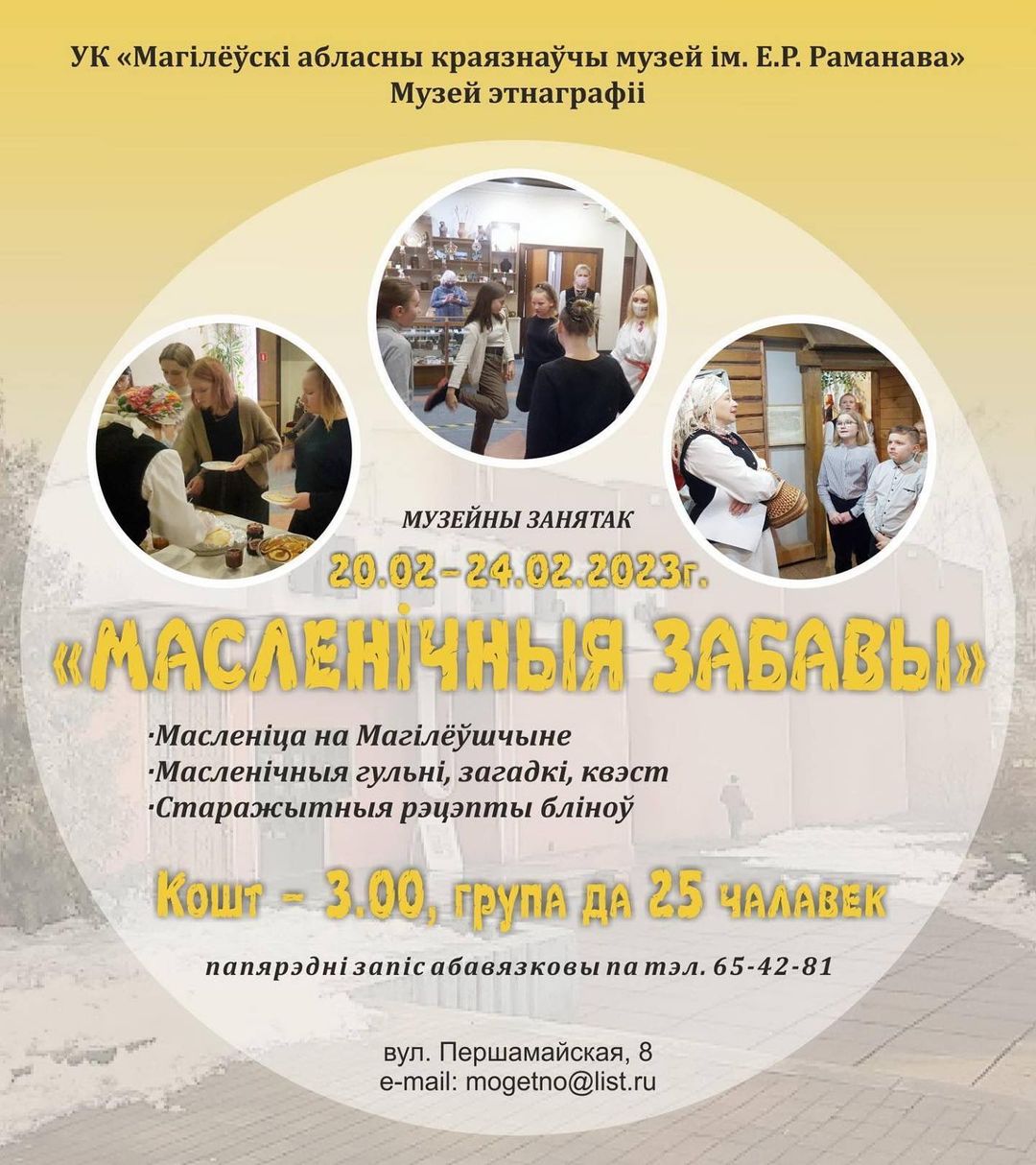 Музейные занятия «Масленічныя забавы» будут проходить в музее этнографии Могилева (ул. Первомайская, 8) с 20 по 24 февраля. Об этом сообщили в учреждении культуры.