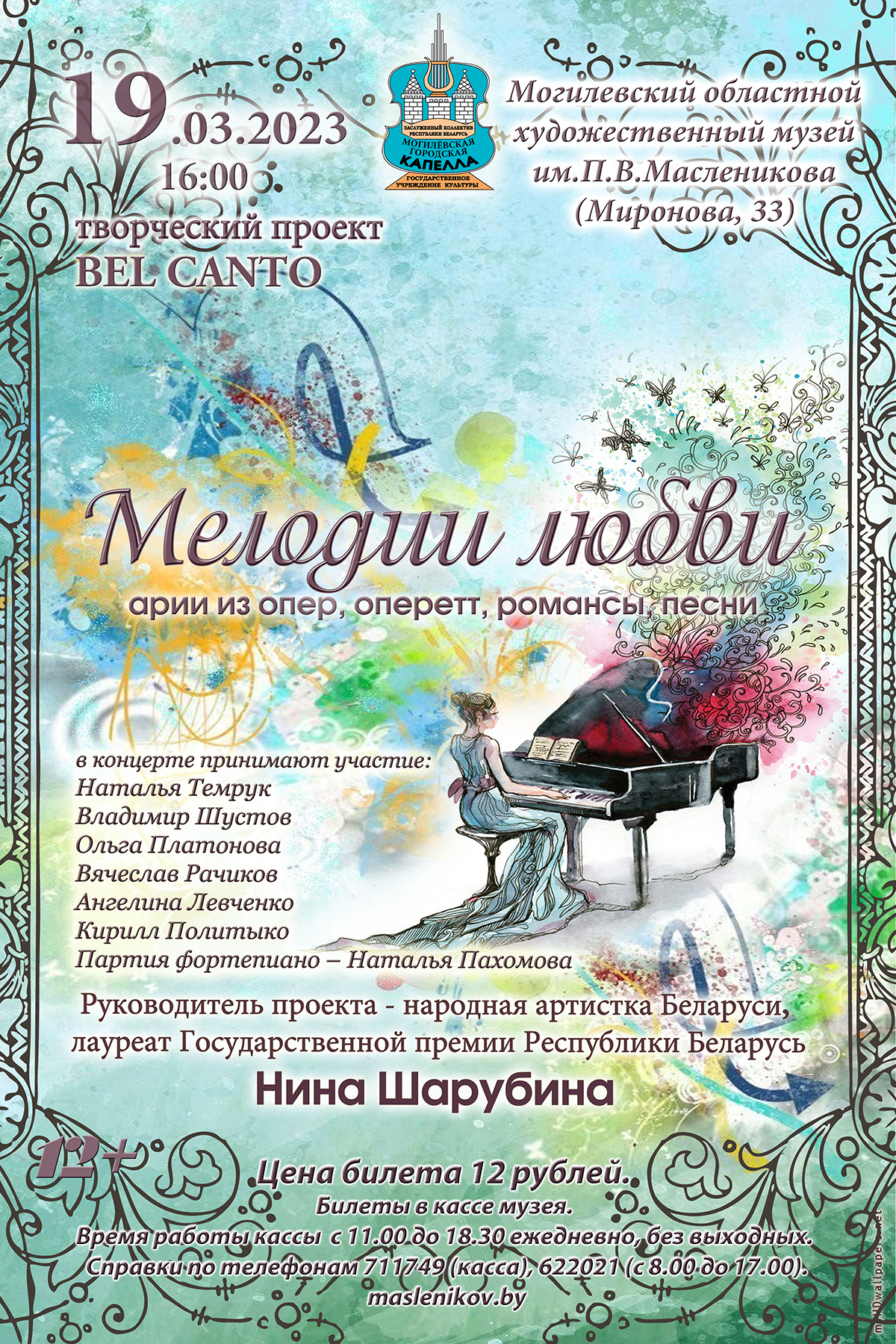 Концерт «Мелодии любви» пройдет в Могилеве 19 марта. Программа будет представлена в музее им. П.В. Масленикова (ул. Миронова, 33).