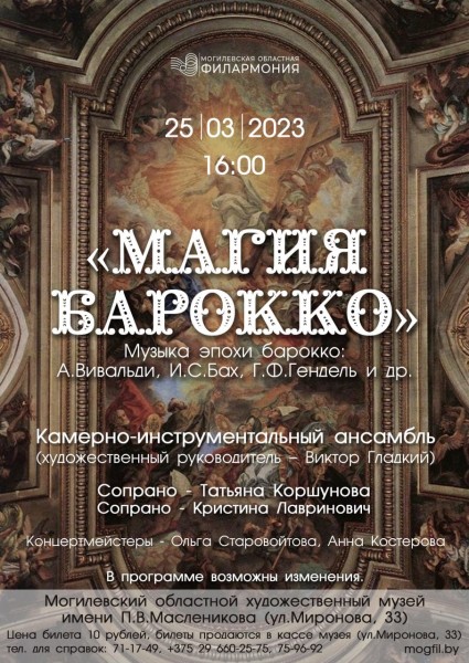 Концерт камерно-инструментального ансамбля и солистов студии классического вокала областной филармонии пройдет в Могилеве 25 марта. Программа «Магия барокко» будет представлена в областном художественном музее им. П.В. Масленикова.