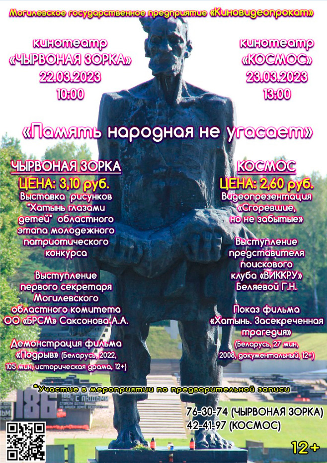 Кинотеатры «Чырвоная Зорка» и «Космос» Могилевского государственного предприятия «Киновидеопрокат» приглашают 22 и 23 марта на киномероприятия «Память народная не угасает», приуроченные ко Дню Хатынской трагедии.