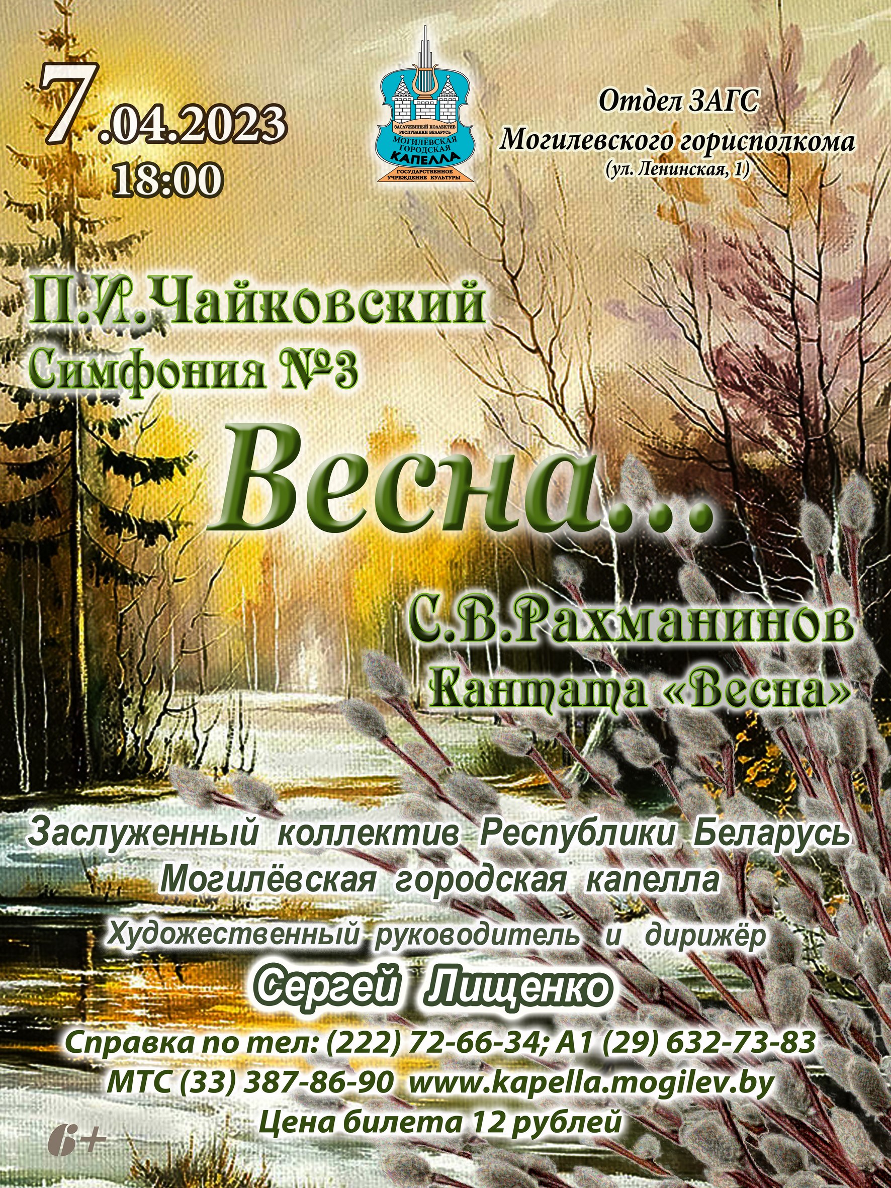 В концерте прозвучат одночастная кантата «Весна» Сергея Рахманинова и Симфония № 3 Петра Чайковского. Любителей классической музыки ждут в золотом зале Могилевского ЗАГСа. Начало концерта в 18:00.