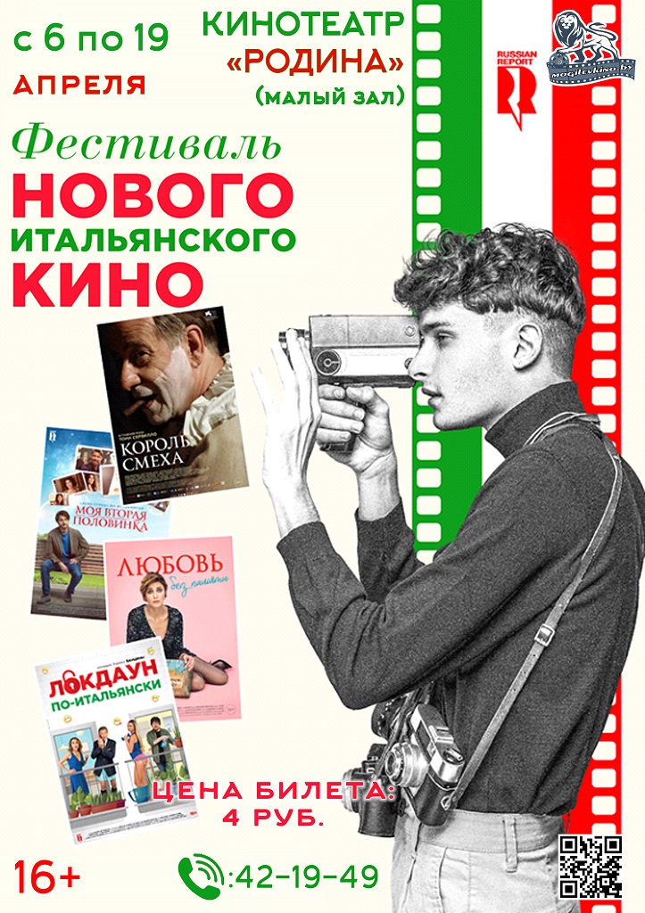 Фестиваль нового итальянского кино предлагают посетить могилевчанам. С 6 по 19 апреля в кинотеатре «Родина» покажут четыре фильма: «Король смеха» (реж. Марио Мартоне), «Моя вторая половинка» (реж. Марко Мартани), «Любовь без памяти» (реж. Франческа Марино) и «Локдаун по-итальянски» (реж. Энрико Ванцина).