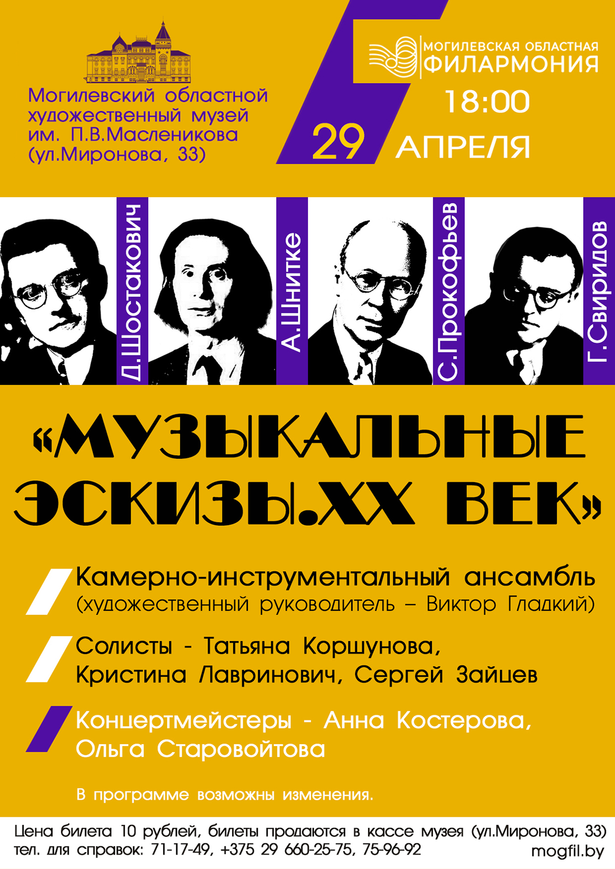 Концерт «Музыкальные эскизы. ХХ век» состоится 29 апреля в Могилевском областном художественном музее им. П.В. Масленикова (ул. Миронова, 33).