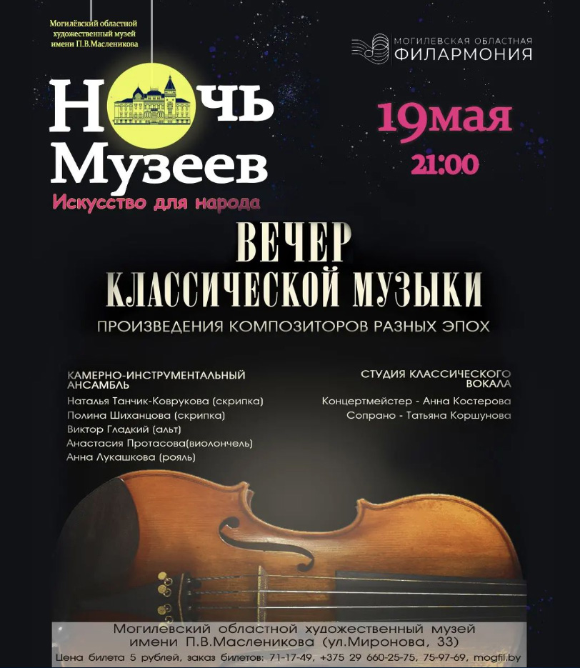 Концертную программу, которая станет частью «Ночи музеев», представят артисты Могилевской областной филармонии. В их исполнении прозвучат произведения композиторов разных эпох.