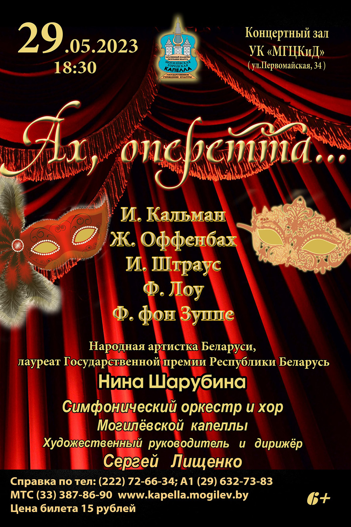 В исполнении Народной артистки Беларуси, лауреата Государственной премии Республики Беларусь Нины Шарубиной, симфонического оркестра и хора Могилевской капеллы прозвучит музыка И. Кальмана, Ж. Оффенбаха, И. Штрауса, Ф. Лоу, Ф. фон Зуппе.