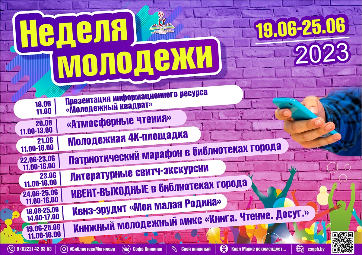 В выходные дни сотрудники библиотек приглашают всех посетить интерактивную территорию эвент-чтений «Литературный QR-код расширяет горизонт». Могилевчан ждут: свободная зона для чтения, игровые площадки («Литературный крокодил», «Книжные фанты», «Литературная игра «Кто я?»), таинственные квесты по книгам, а также разнообразные мастер-классы от сотрудников библиотек и многое другое.