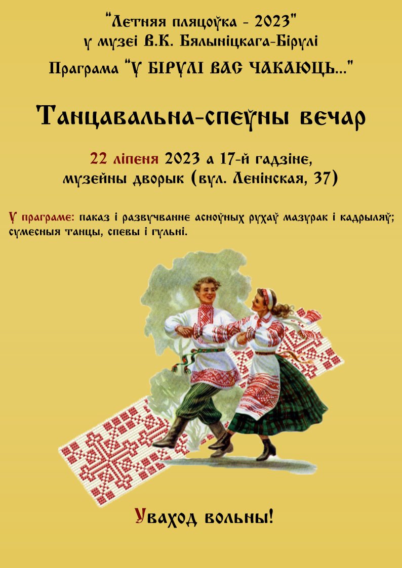 Танцевально-песенный вечер пройдет 22 июля (суббота) в музее В.К. Бялыницкого-Бирули Могилева. Об этом сообщили в учреждении культуры.