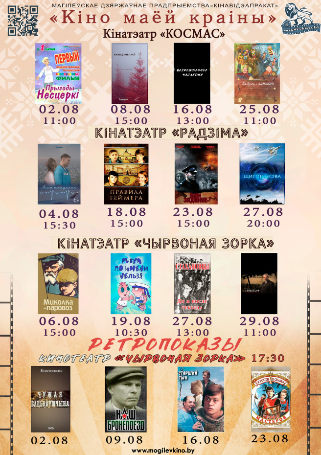 В могилевских кинотеатрах «Родина», «Чырвоная Зорка» и «Космос» в рамках киноакции «Кiно маёй краiны» весь август проходят показы фильмов отечественного производства. Об этом сообщили на предприятии «Киновидеопрокат».