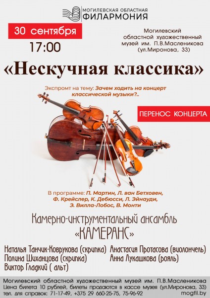 Концерт «Нескучная классика», который должен был состояться в Могилеве 23 сентября, переносится. Как сообщили в областной филармонии, программа будет представлена неделей позже — 30 сентября (суббота).