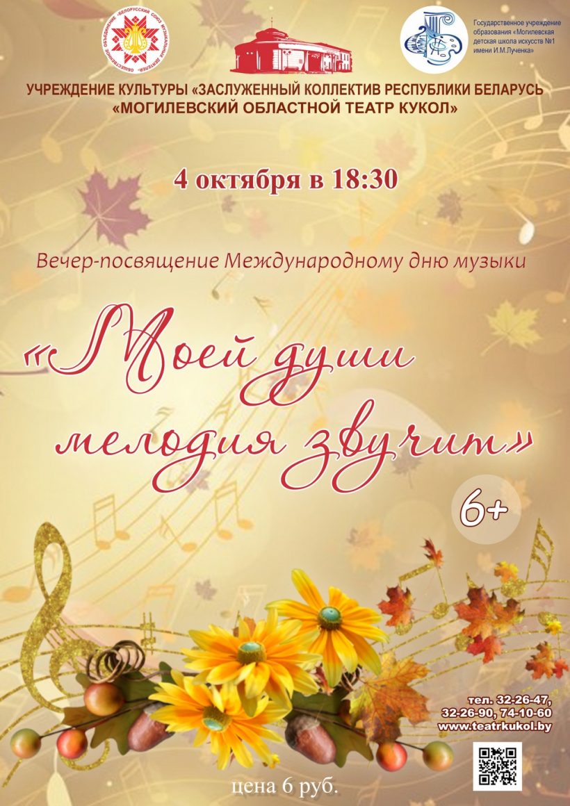 Могилевский областной театр кукол и областное отделение Белорусского союза музыкальных деятелей приглашают 4 октября в 18:30 на творческий вечер «Моей души мелодия звучит», приуроченный к Международному дню музыки.