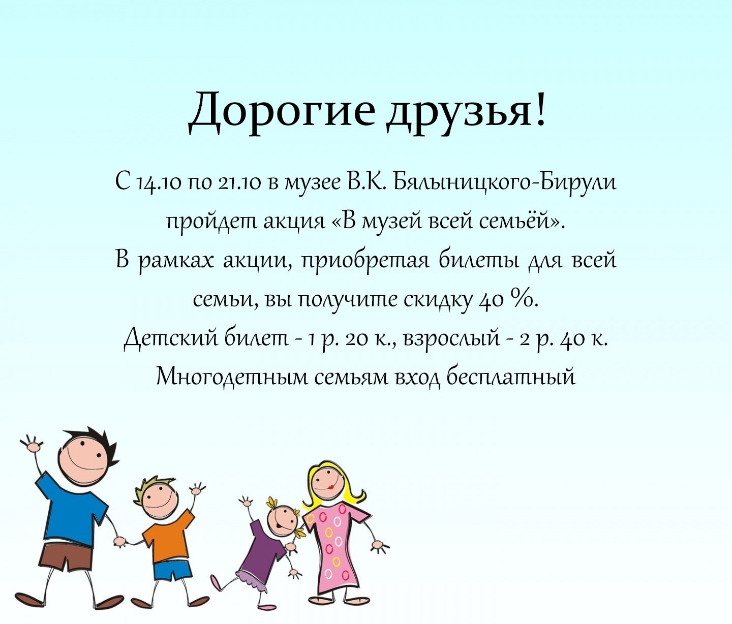 С 14 по 21 октября в музее В.К. Бялыницкого-Бирули пройдет акция «В музей всей семьей». Об этом сообщили в учреждении культуры.