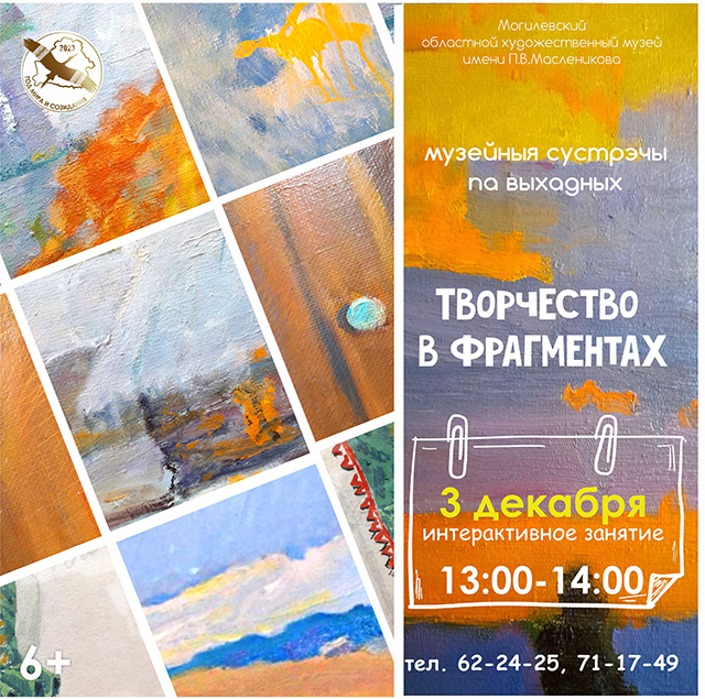В воскресенье, 3 декабря, в музее пройдет занятие «Творчество в фрагментах», во время которого могилевчан познакомят с жизнью и творчеством знаменитого белорусского художника П.В. Масленикова, а далее участники мероприятия смогут проверить свою внимательность и память в викторине.