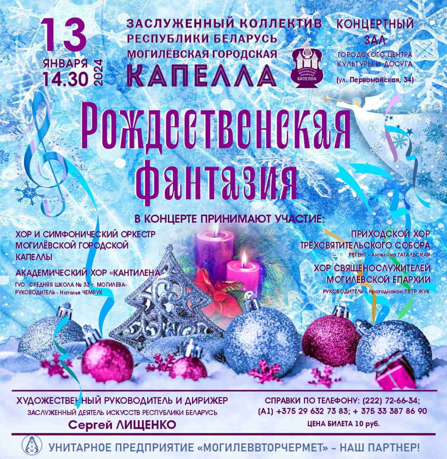 Концерт «Рождественская фантазия» состоится в Могилеве 13 января. Программа будет представлена в городском Центре культуры и досуга (ул. Первомайская, 34).