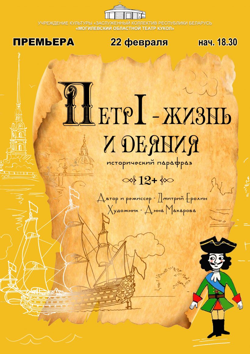 Могилевский областной театр кукол готовит премьеру — спектакль «Петр I — жизнь и деяния». Над постановкой работает главный режиссер театра кукол «Золотой петушок» Дмитрий Ерохин (г.Озерск, Российская Федерация).