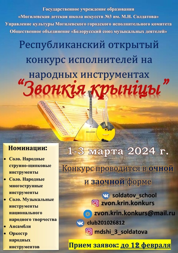 Республиканский открытый конкурс исполнителей на народных инструментах «Звонкія крыніцы» пройдет с 1 по 3 марта в Могилеве на базе детской школы искусств № 3 им. М.Н.Солдатова. Творческое состязание будет организовано в очной и заочной (дистанционной) форме.