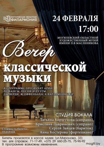 Вечер классической музыки пройдет 24 февраля в музее им. П.В.Масленикова. Программу представит студия вокала Могилевской областной филармонии (художественный руководитель — Татьяна Коршунова).