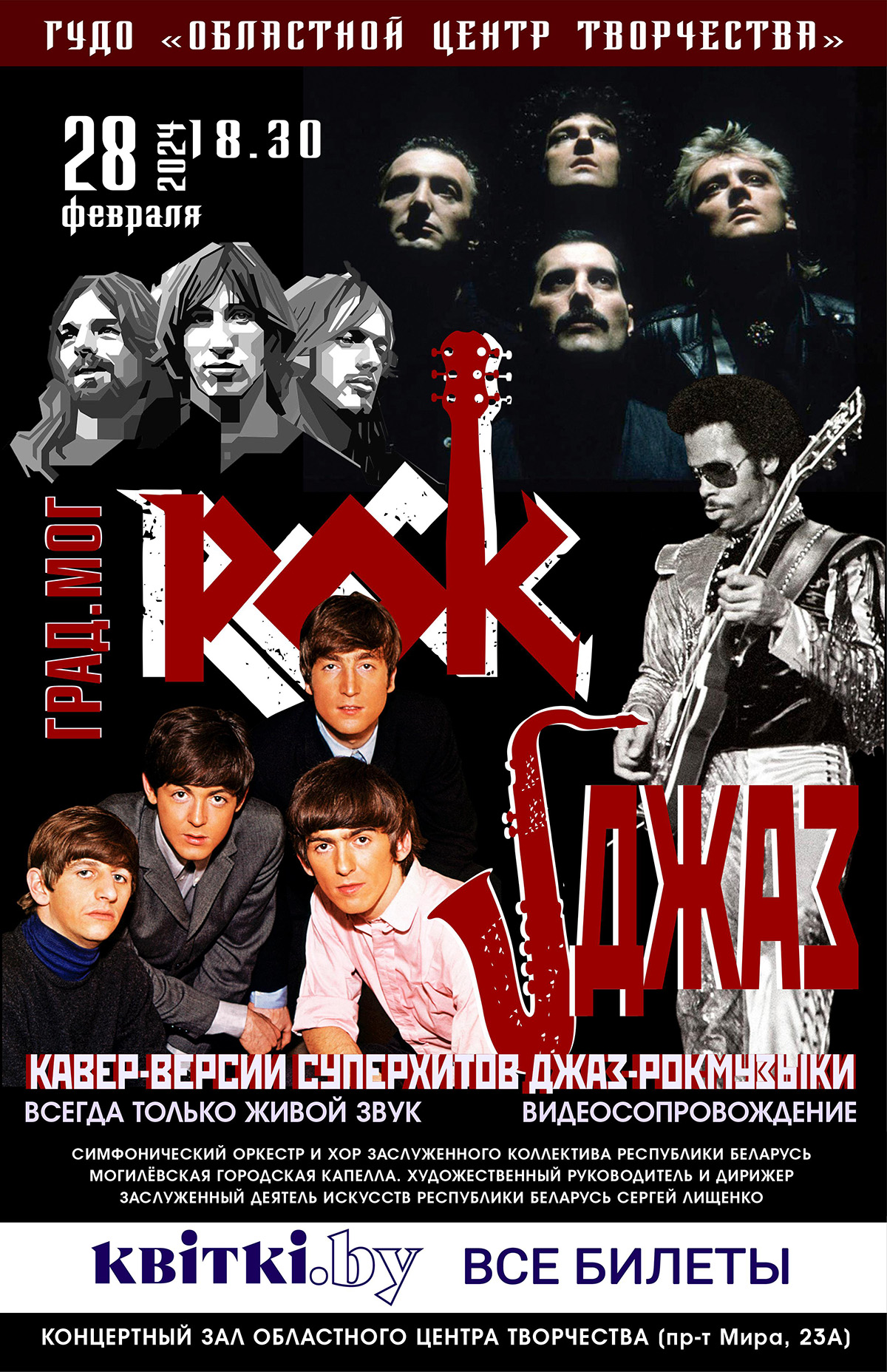 В исполнении симфонического оркестра и хора капеллы для могилевчан прозвучат хиты таких культовых групп и исполнителей как Queen, Beatles, Pink Floyd, Smokie, ABBA, Stevie Wonder и многих других.