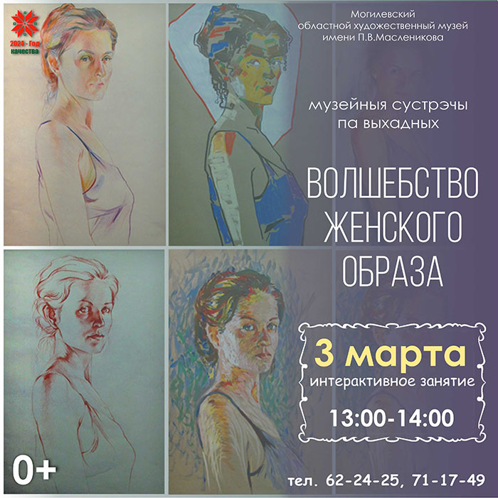 В воскресенье, 3 марта, в музее пройдет интерактивно-познавательное занятие, рассчитанное на детей дошкольного и младшего школьного возраста. Во время мероприятия на примере женских образов ребята познакомятся с жанром портрет, узнают, какие бывают виды портрета, а в конце занятия всех ждет увлекательный процесс рисования.