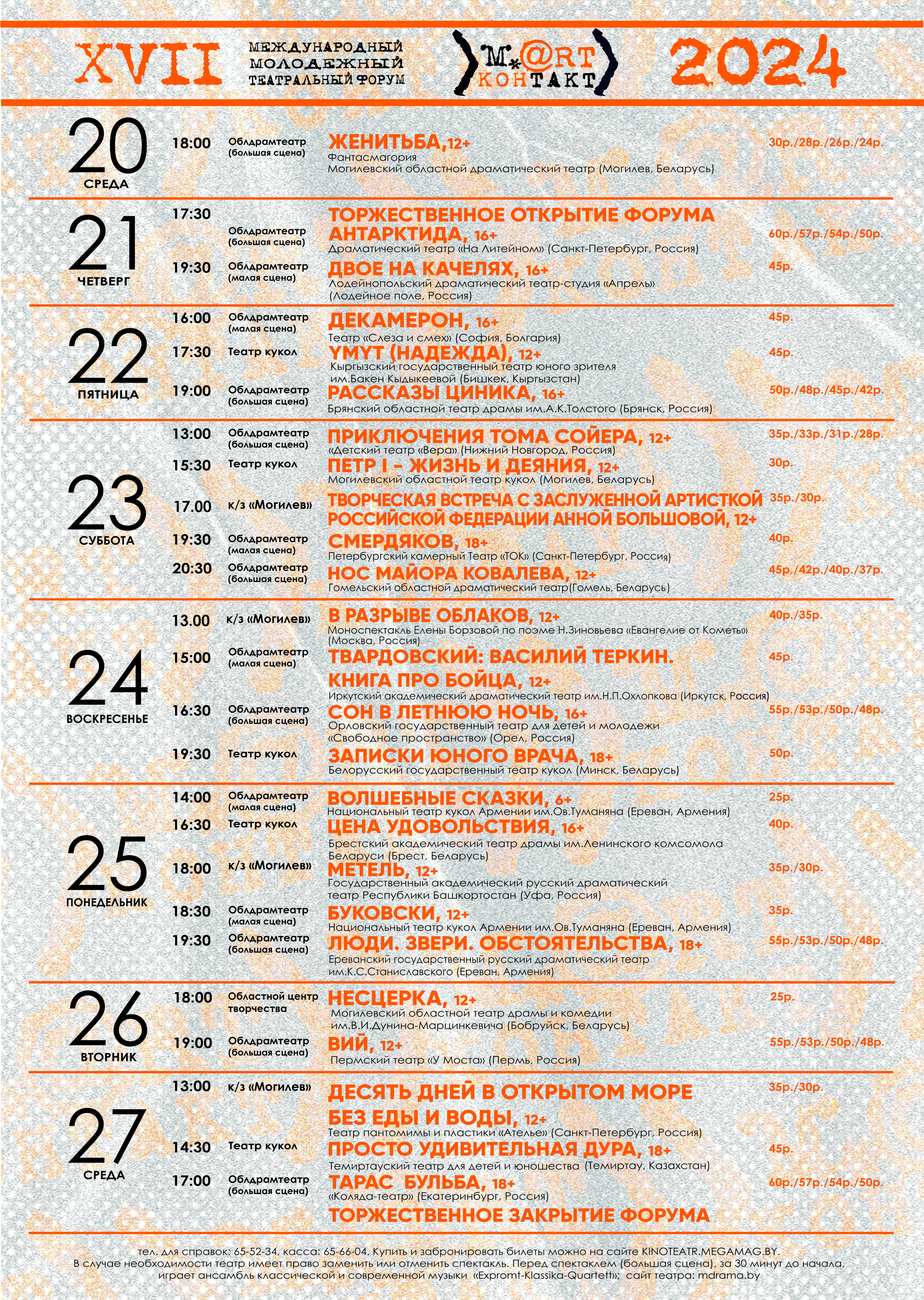 До старта Международного молодежного театрального форума "М.@rt.Контакт" осталась одна неделя. Главное культурное событие марта будет проходить с 20 по 27 марта. Рассказываем подробно, какие спектакли увидит могилевский зритель. К слову, на отдельные постановки билетов уже не достать.