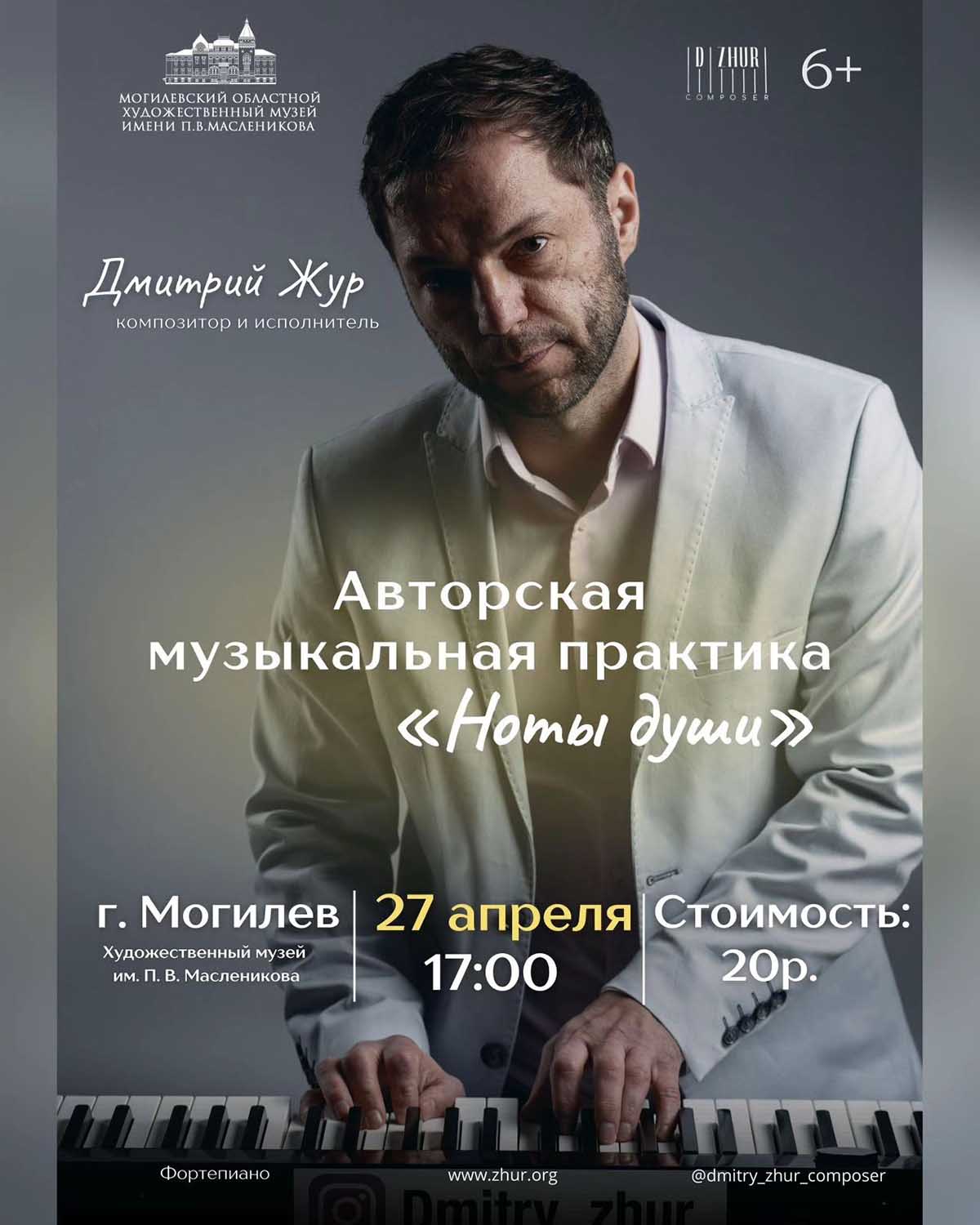 Концерт белорусского композитора и музыканта Дмитрия Жура пройдет в Могилеве 27 апреля. Авторская музыкальная практика «Ноты души», во время которой зрители смогут услышать ответы на самые сокровенные вопросы, волнующие человека, обрести вдохновение и внутренний покой, будет представлена в художественном музее им. П.В. Масленикова (ул.Миронова, 33), сообщили в учреждении культуры.