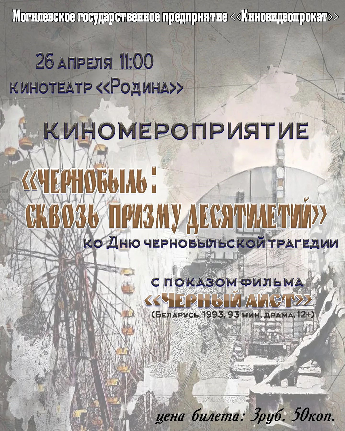 Киномероприятие «Чернобыль: сквозь призму десятилетий», приуроченное ко Дню Чернобыльской трагедии, состоится в могилевском кинотеатре «Родина» 26 апреля. Об этом сообщили на предприятии «Киновидеопрокат».
