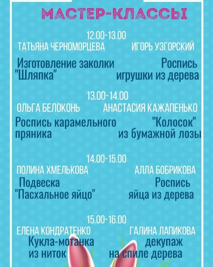 Кроме того, с 12.00 до 16.00 могилевчан приглашают посетить мастер-классы ремесленников: по изготовлению заколки «Шляпка», куклы-мотанки из ниток, подвески «Пасхальное яйцо»; росписи игрушки из дерева, карамельного пряника и др.