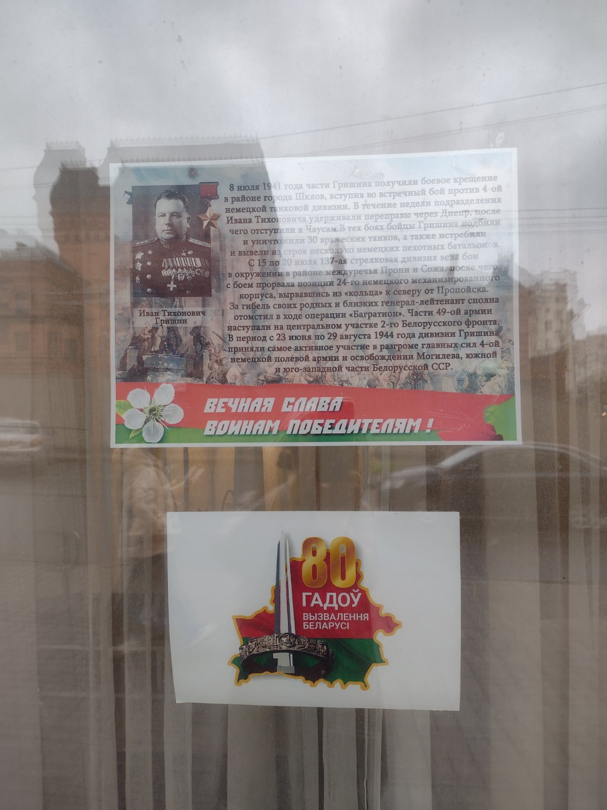 К 80-летию освобождения Беларуси от немецко-фашистских захватчиков в окнах выставочного зала музея истории Могилева (ул. Болдина,1) оформлена выставка «Вечная слава воинам-победителям». На ней размещены портреты воинов, удостоенных звания Героя Советского Союза за освобождение города Могилева и Могилевского района, а также биографический материал об их боевых заслугах.