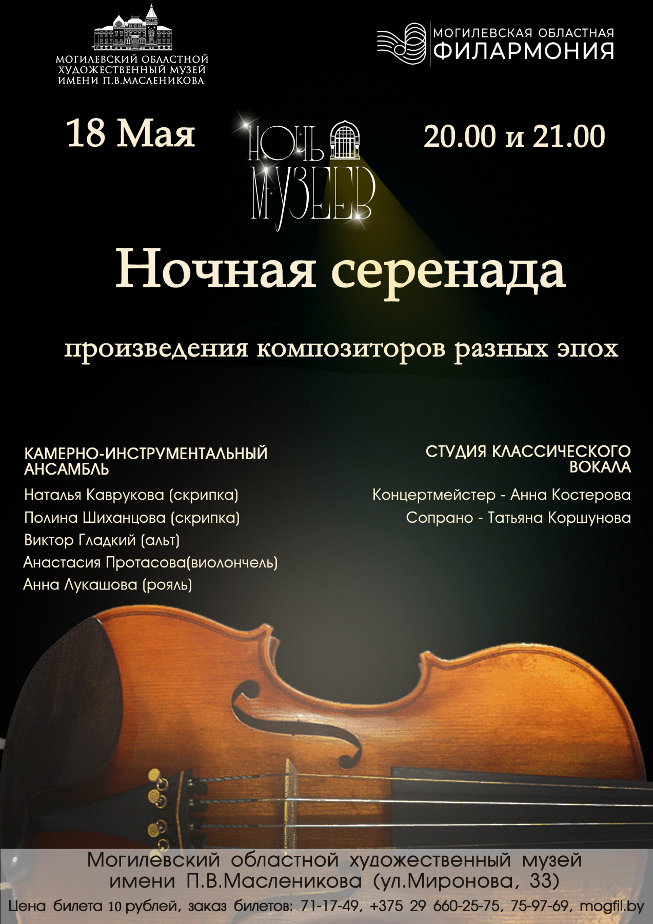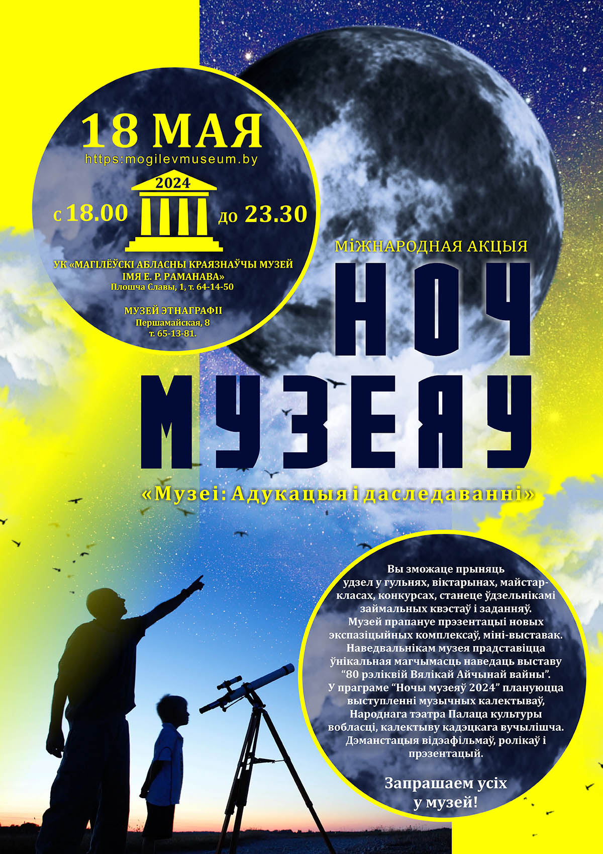 Насыщенную программу в рамках акции «Ночь музеев» готовят также областной краеведческий музей (пл.Славы, 1) и музей этнографии (ул. Первомайская, 8). Здесь мероприятия пройдут с 18.00 до 23.30. Могилевчан ожидают игры, викторины, мастер-классы, конкурсы; презентации новых экспозиционных комплексов, мини-выставок; выступления музыкальных коллективов и многое другое.