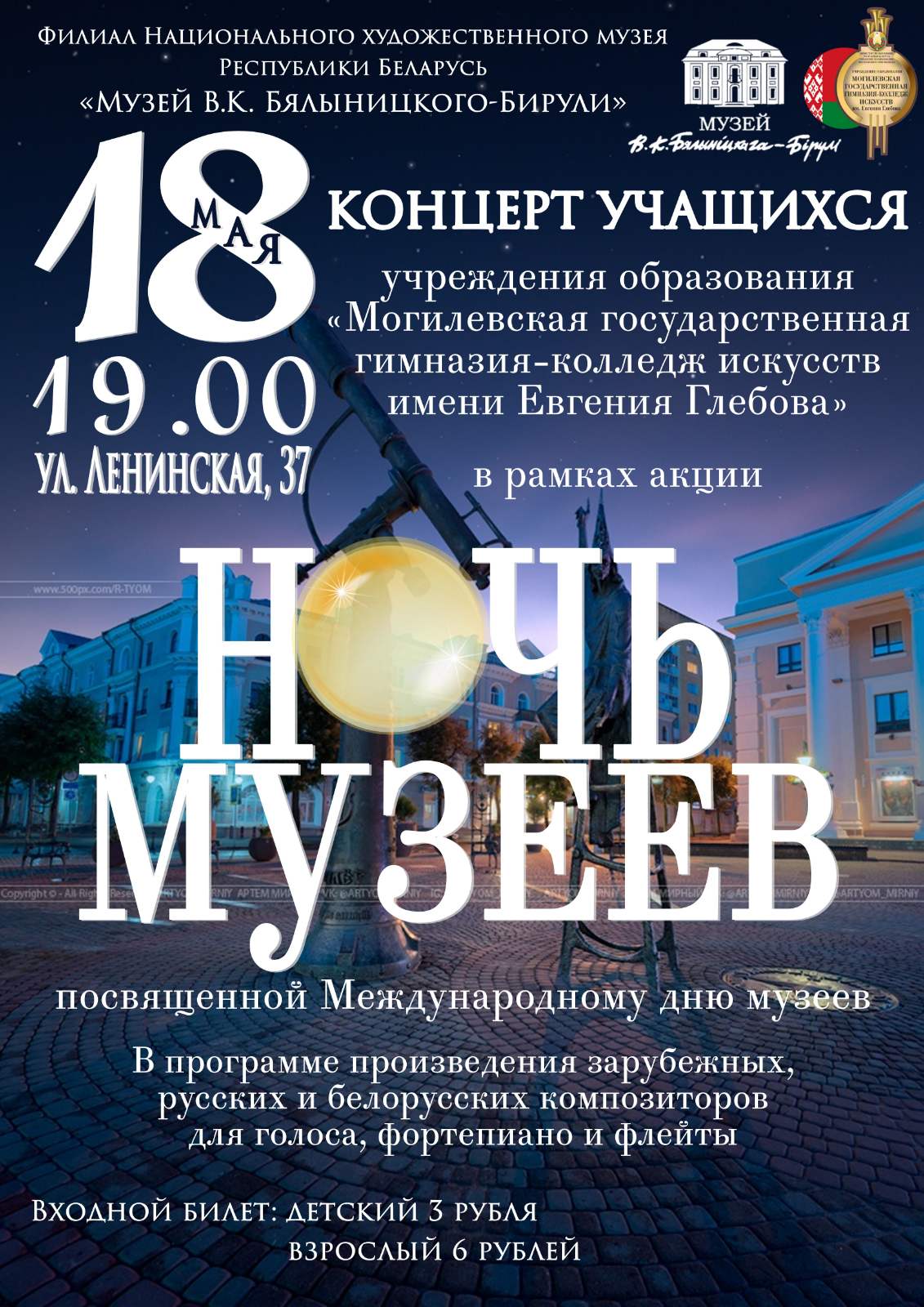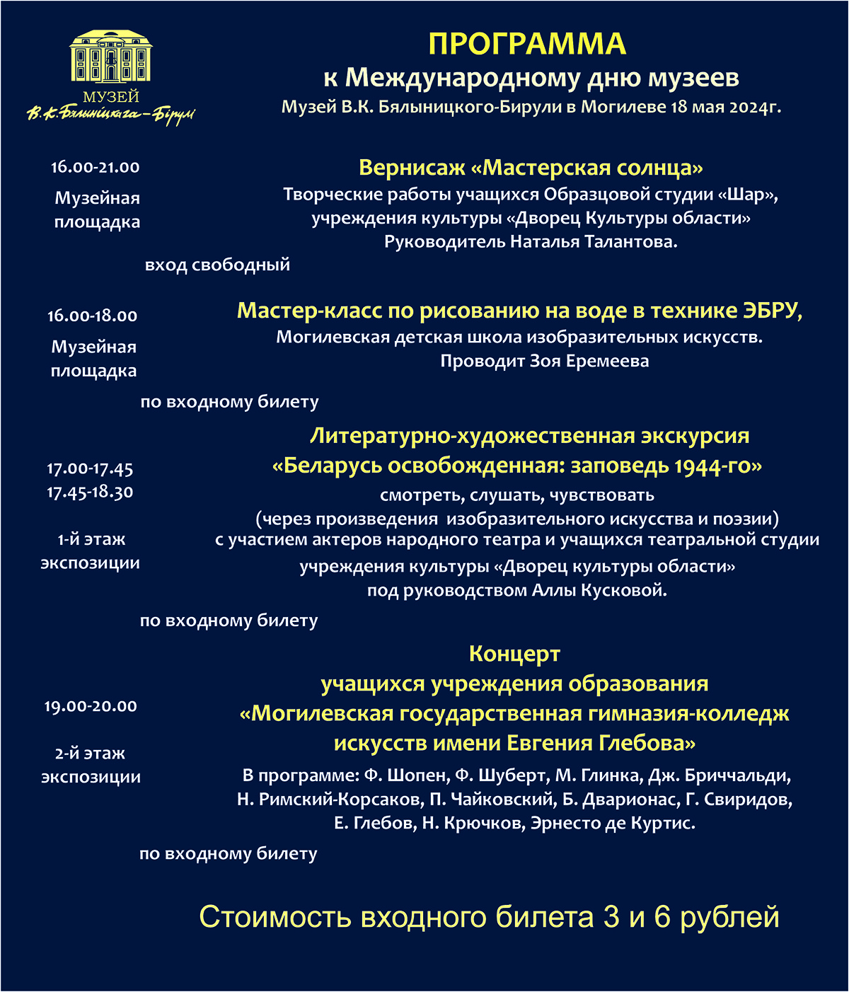 В музее В.К. Бялыницкого-Бирули (ул. Ленинская, 37) состоится мастер-класс по рисованию на воде в технике Эбру, вернисаж «Мастерская солнца», будет организована литературно-художественная экскурсия «Беларусь освобожденная: заповедь 1944-го». В 19.00 начнется концерт учащихся Могилевской государственной гимназии-колледжа искусств имени Евгения Глебова, во время которого для гостей музея прозвучат произведения Ф.Шопена, Ф.Шуберта, М.Глинки, П. Чайковского, Е.Глебова и других композиторов.