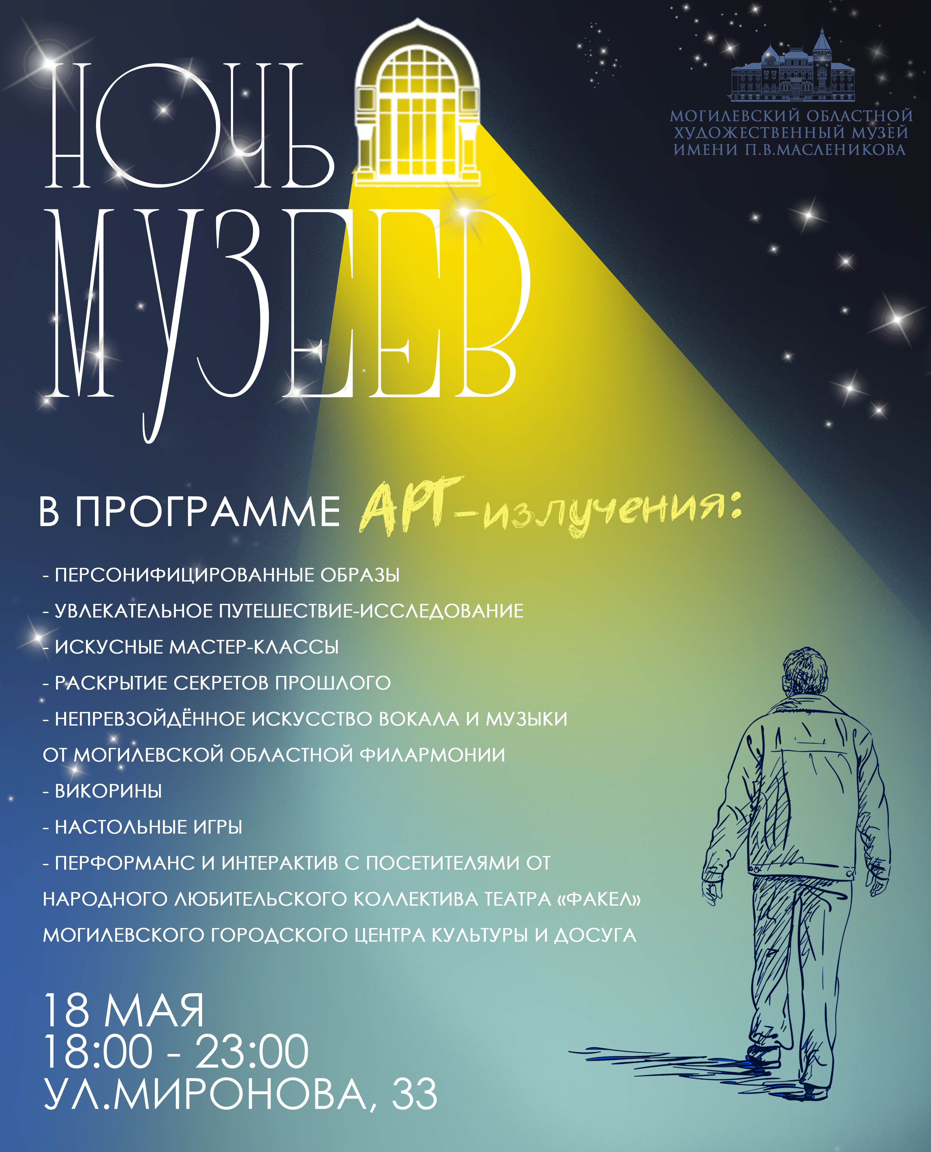 Так, в областном художественном музее им. П.В. Масленикова (ул. Миронова, 33) с 18.00 до 23.00 пройдет интерактивное мероприятие «Арт-излучение». В программе: персонифицированные образы; викторины, настольные игры; увлекательное путешествие-исследование; мастер-классы; непревзойденное искусство вокала и музыки от Могилевской областной филармонии; перформанс и интерактив с посетителями от народного любительского коллектива театра "Факел" Могилевского городского Центра культуры и досуга.