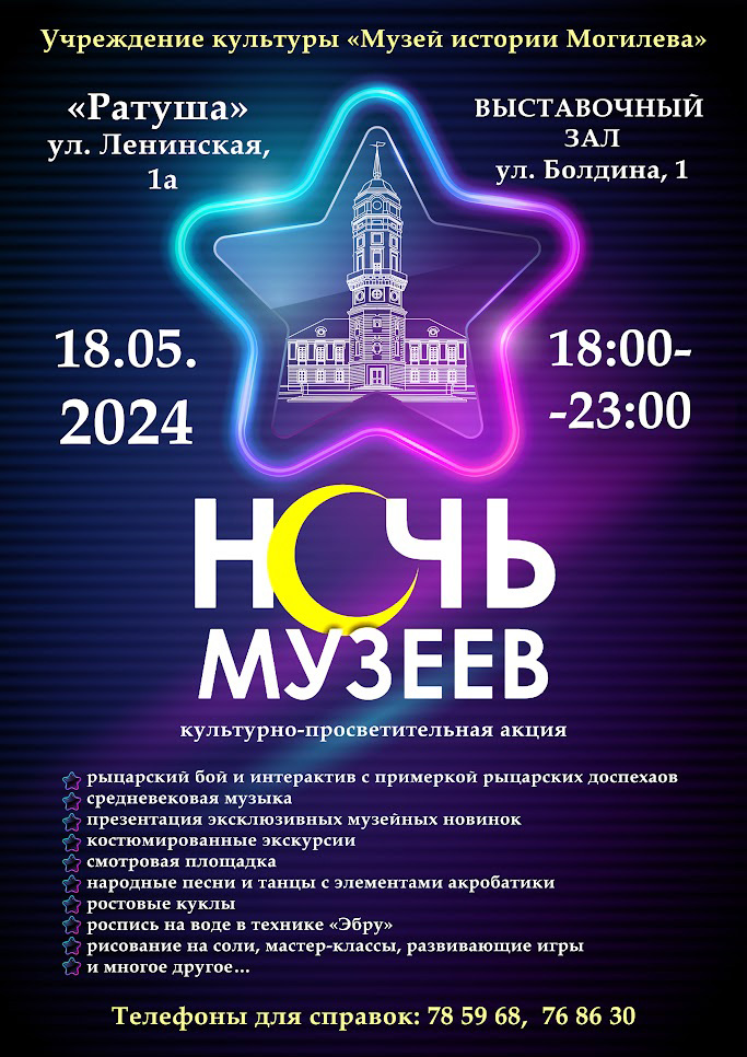 18 мая в Музее истории Могилева состоится культурно-просветительская акция «Ночь музеев в Ратуше». Как рассказали в учреждении культуры, мероприятия пройдут как в самом музее, так и в выставочном зале с 18.00 до 23.00.