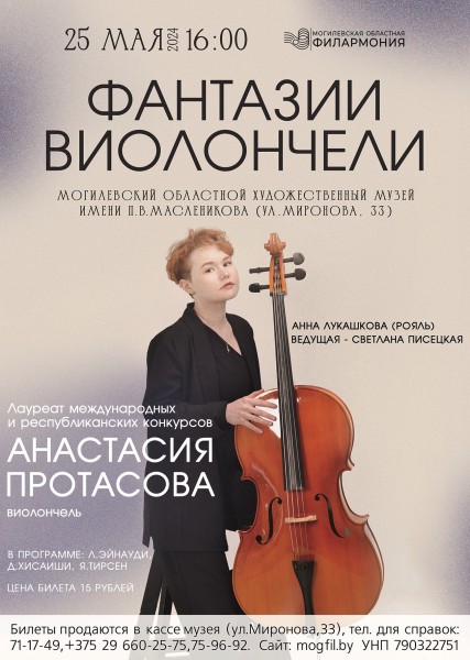Концерт «Фантазии виолончели» пройдет в областном художественном музее им. П.В. Масленикова 25 мая. Программу представит лауреат международных и республиканских конкурсов, виолончелистка Анастасия Протасова.