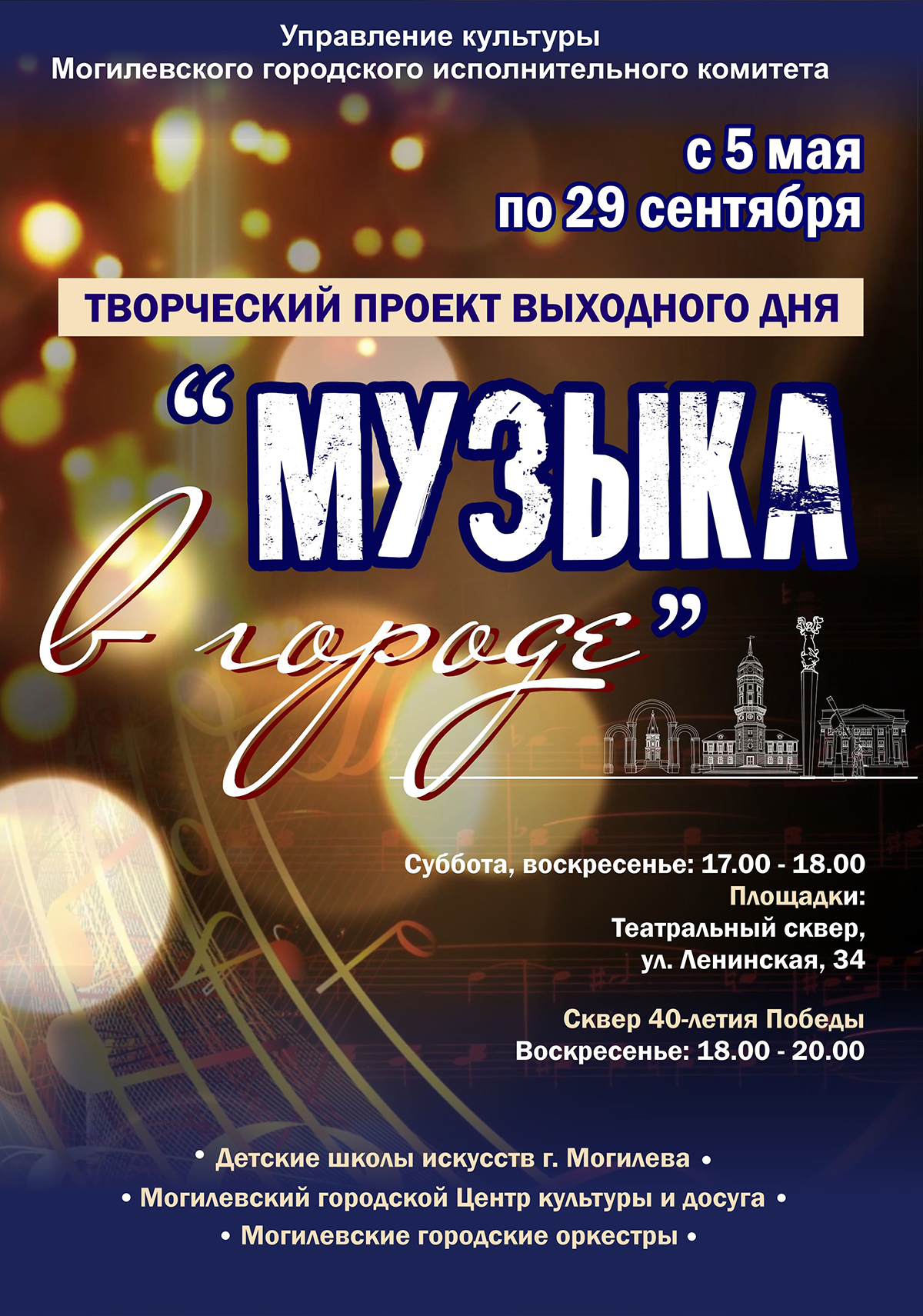 Творческий проект «Музыка в городе» вновь начал работу в Могилеве. Как рассказали в управлении культуры горисполкома, по выходным дням на открытых площадках города в живом исполнении можно услышать музыкальные произведения в различных жанрах, направлениях и стилях.