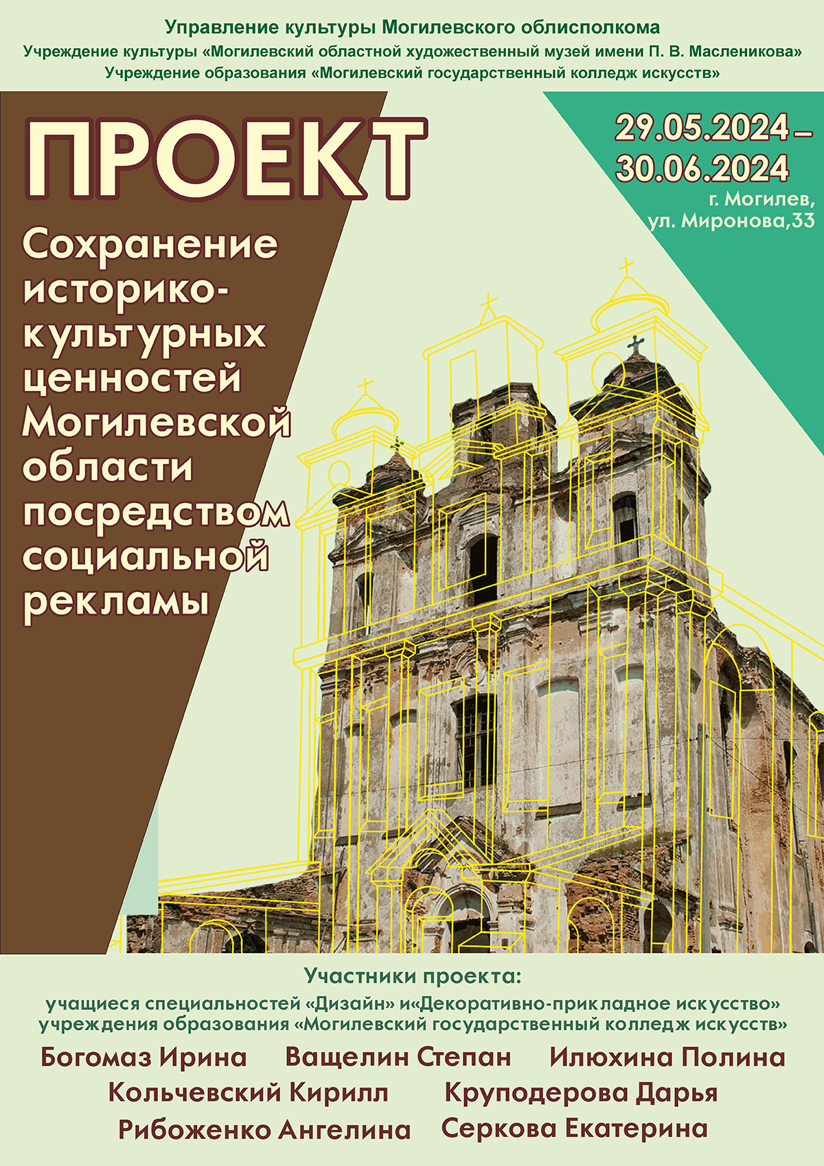 — Сегодня в Республике Беларусь сохранению историко-культурных ценностей уделяется пристальное внимание. За счет средств государственной помощи с каждым годом обретают вторую жизнь прекрасные объекты наследия. Одновременно ряд памятников требует консервации и последующего восстановления, — отметили в музее. — Проект включает в себя социальные плакаты, созданные учащимися отделения традиционной культуры и современного искусства, с темой привлечения внимания общественности к сохранению и восстановлению объектов историко-культурного наследия Могилевского региона.