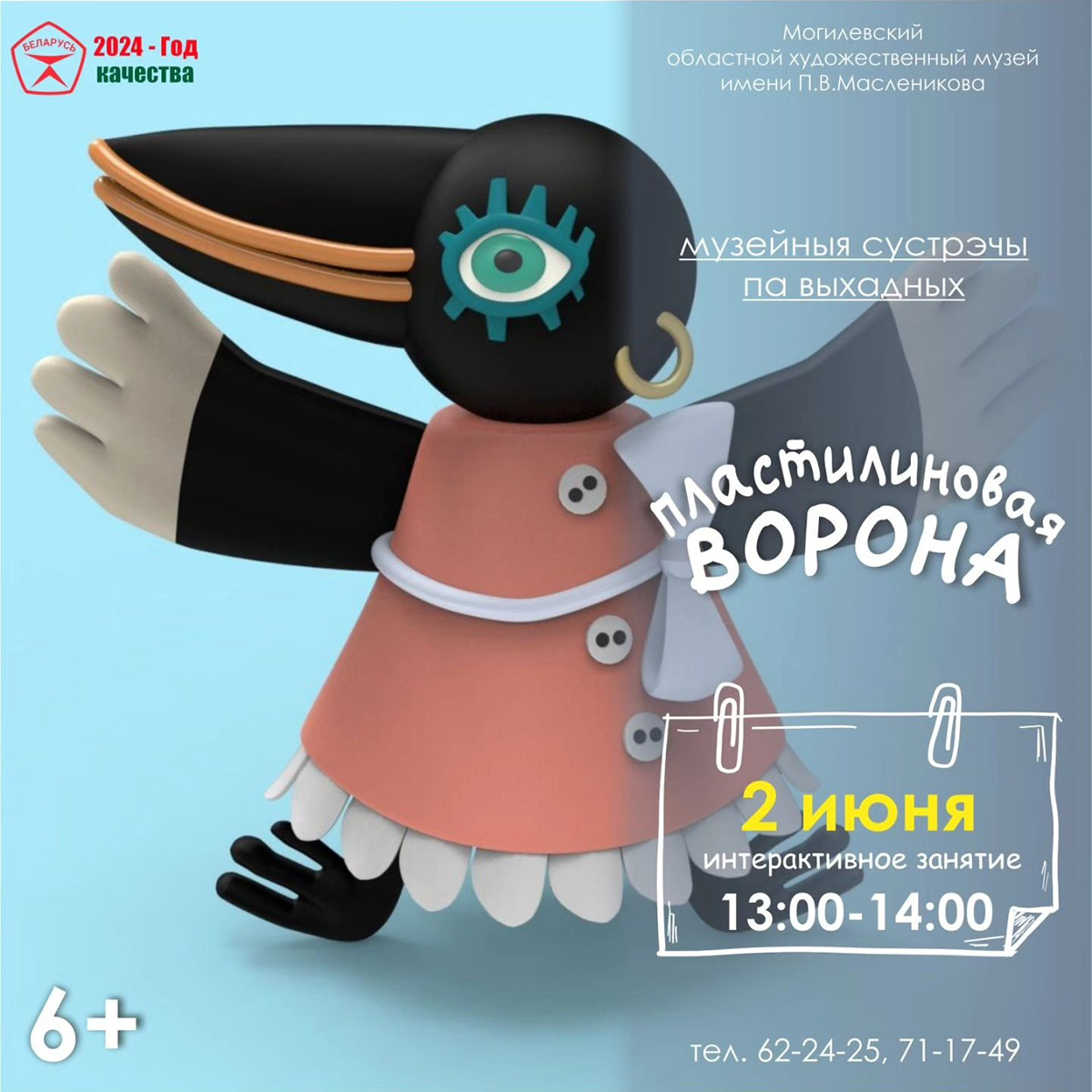 В воскресенье, 2 июня, в музее пройдет интерактивное занятие «Пластилиновая ворона», во время которого могилевчане познакомятся с пластилиновой анимацией, мультфильмом Александра Татарского, а также своими руками создадут пластилинографию главной героини его произведения.