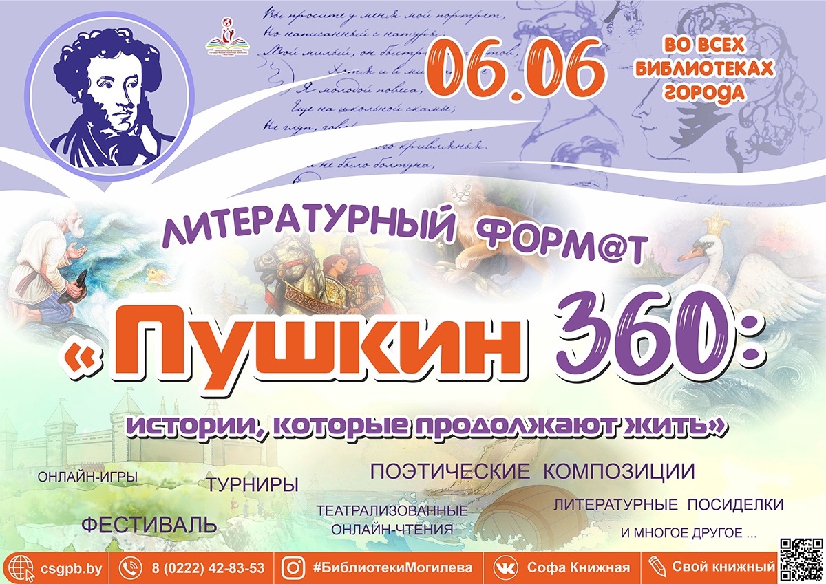 В библиотеках Могилева 6 июня пройдут тематические мероприятия в литературном формате «Пушкин 360: истории, которые продолжают жить» (квесты, литературные мастерские, квизы), приуроченные к 225-летию со дня рождения А.С. Пушкина.