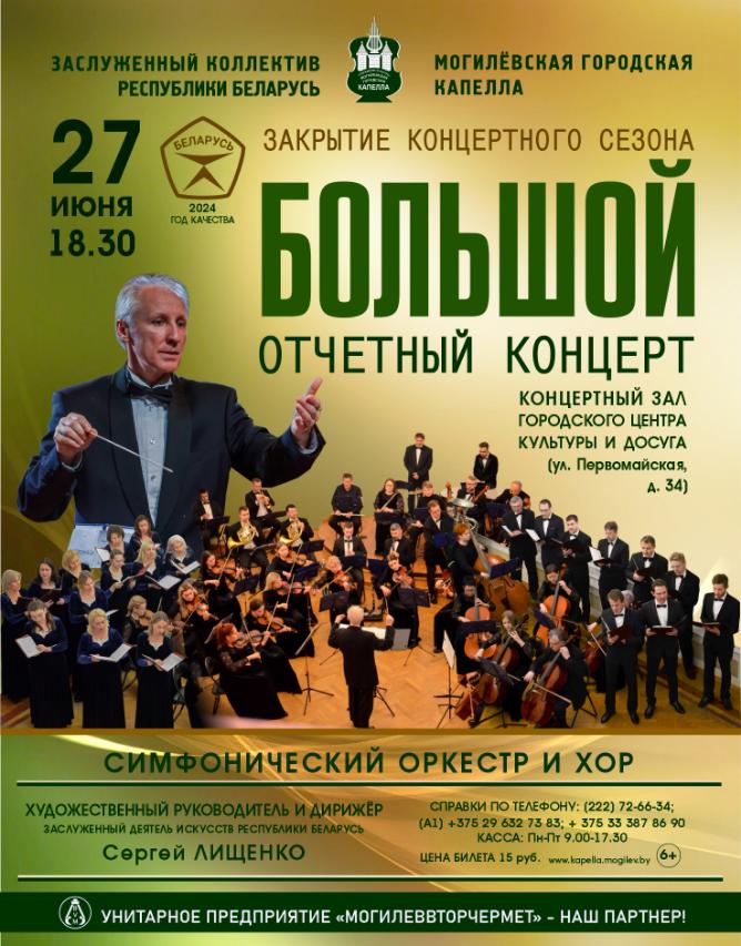 С большим отчетным концертом по случаю закрытия сезона выступит Могилевская городская капелла (художественный руководитель и дирижер Сергей Лищенко) 27 июня. Программа будет представлена на сцене городского центра культуры и досуга (ул. Первомайская, 34).