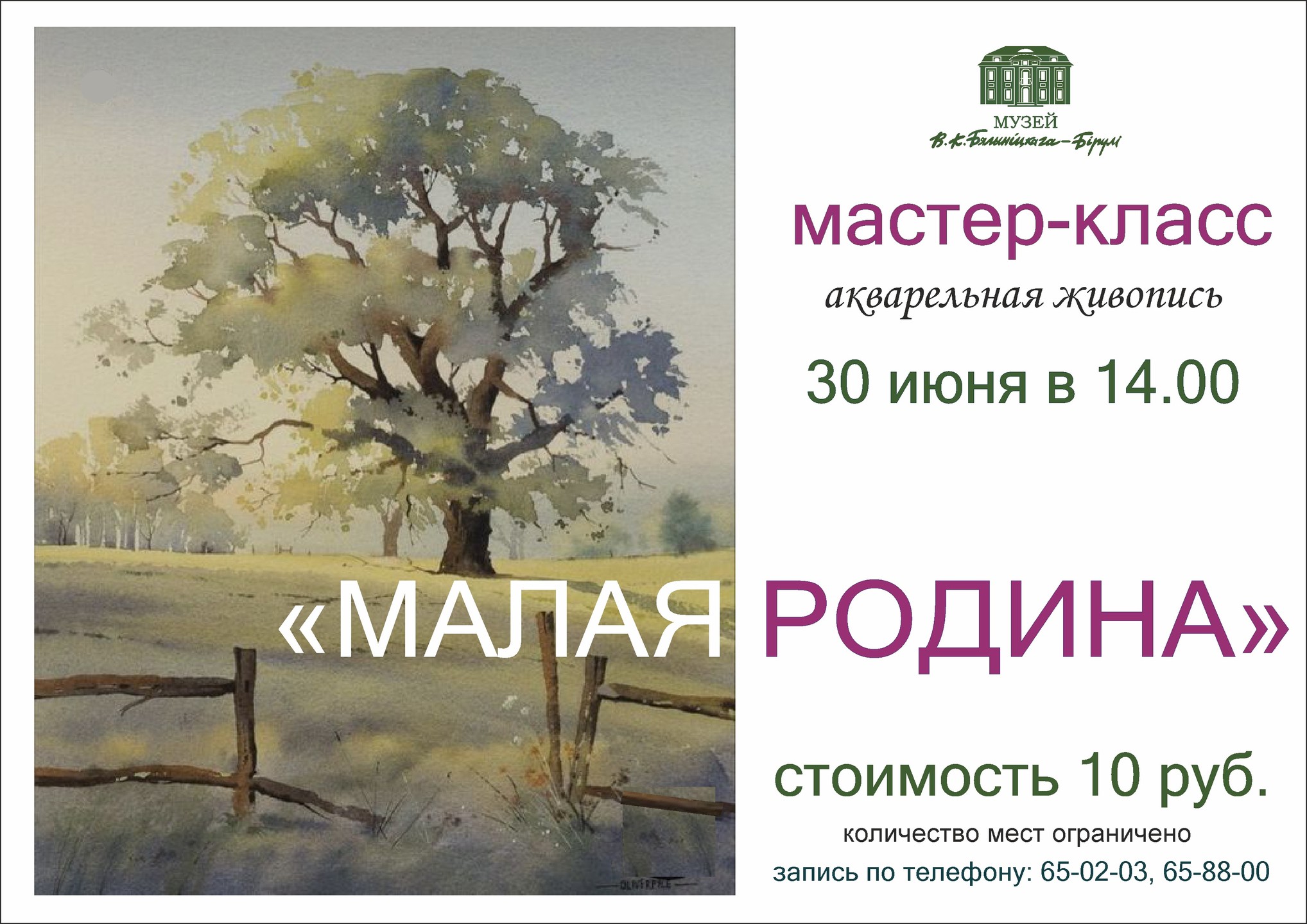 Мастер-класс по акварельной живописи «Малая родина» пройдет в воскресенье, 30 июня, в музее В.К. Бялыницкого-Бирули. Об этом сообщили в учреждении культуры.