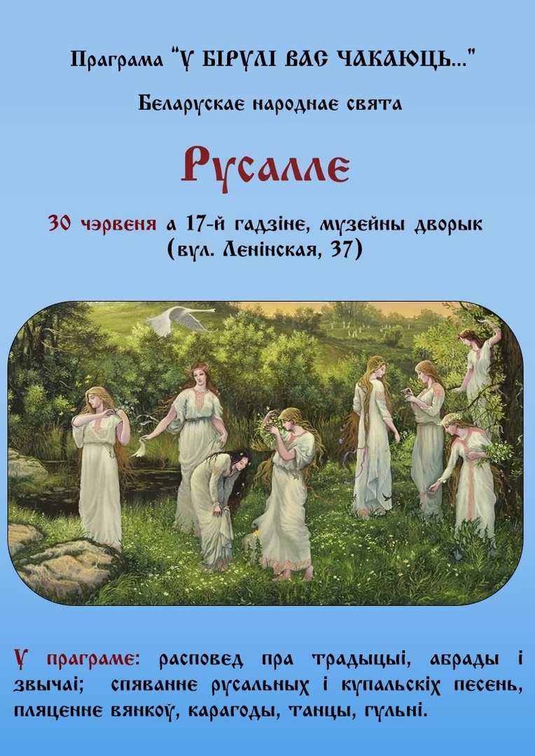 Тематическое мероприятие «Русалье» пройдет в музее В.К. Бялыницкого-Бирули 30 июня. Об этом сообщили в учреждении культуры. В программе — рассказ о традициях и обычаях празднования, пение русальных и купальских песен, плетение венков, хороводы, танцы, игры. Начало в 17:00.