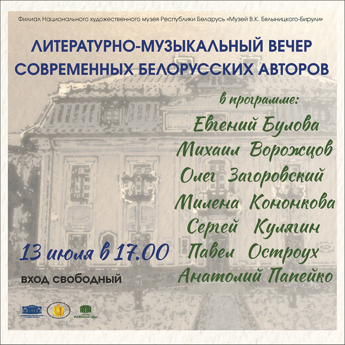 Литературно-музыкальный вечер современных белорусских авторов пройдет 13 июля в музее В.К. Бялыницкого-Бирули (ул.Ленинская, 37).