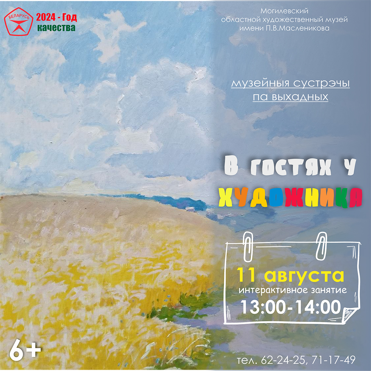 В воскресенье, 11 августа, в музее пройдет интерактив по картинной галерее П.В. Масленикова «В гостях у художника». В программе также: игра «Найди картину»; разгадывание кроссвордов и др.