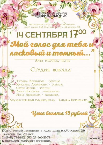Концертная программа «Мой голос для тебя и ласковый и томный...» студии вокала Могилевской областной филармонии (художественный руководитель — Татьяна Коршунова) состоится 14 сентября.