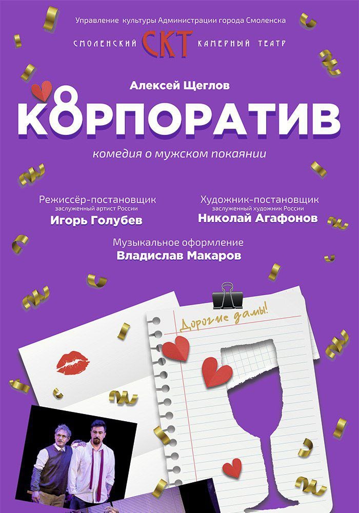 Смоленский камерный театр 22 сентября приедет с гастролями в Могилев. На сцене областного драмтеатра коллектив представит комедию о мужском покаянии «Корпоратив» (фарс, мелодрама).