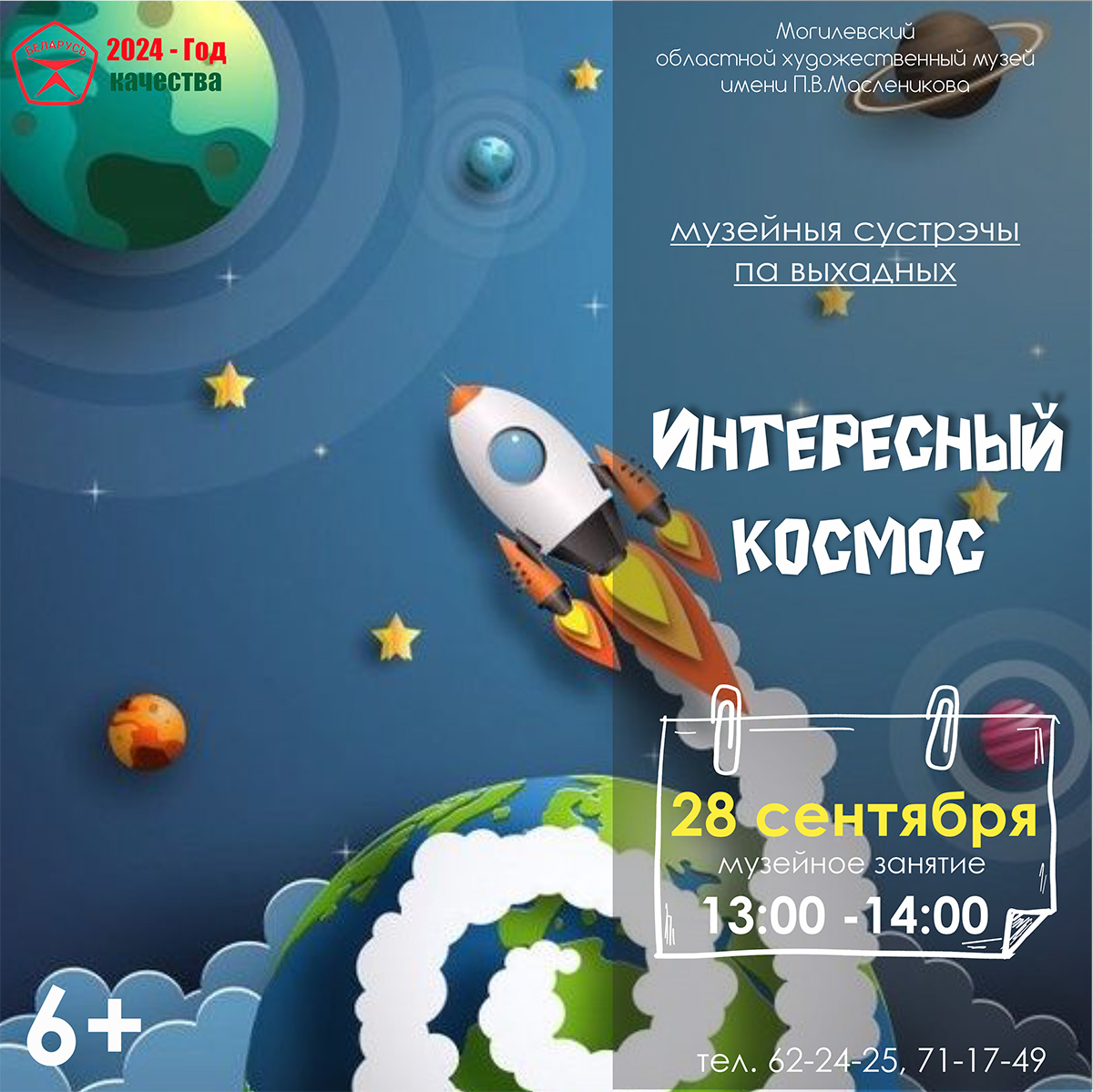В субботу, 28 сентября, в учреждении культуры состоится музейное занятие «Интересный космос», во время которого ребята узнают о первом полете человека в космос, о том, сколько планет, звезд и созвездий в солнечной системе, о принципах работы космических ракет, спутников, луноходов. Также все желающие смогут попробовать разгадать космические загадки.