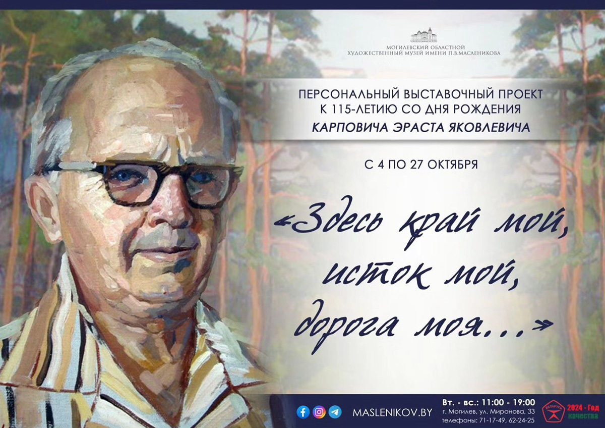 Торжественное открытие выставки «Здесь край мой, исток мой, дорога моя...», посвященной 115-летию со дня рождения белорусского художника, живописца, графика, педагога Эраста Карповича состоится в музее им. П.В.Масленикова 4 октября. Об этом сообщили в учреждении культуры.
