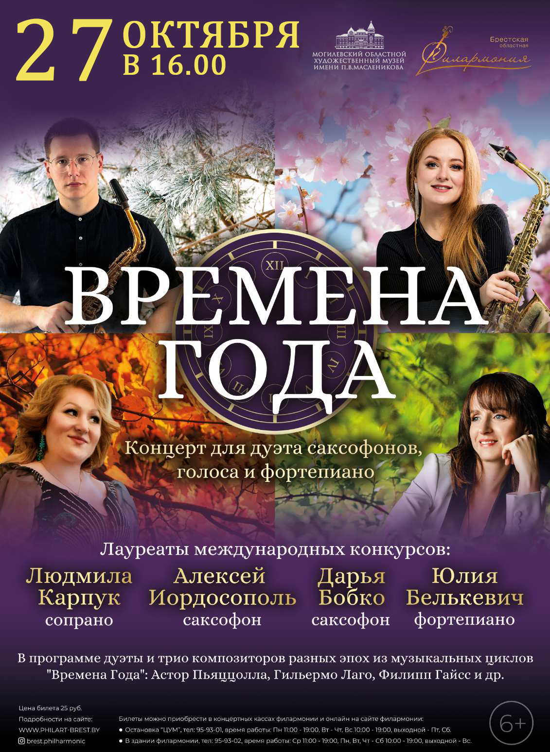 В программе — дуэты и трио композиторов разных эпох из музыкальных циклов «Времена года» (Астор Пьяццолла, Гильермо Лаго, Филипп Гайсс и др.). Исполнят композиции лауреаты международных конкурсов Людмила Карпук (сопрано), Алексей Иордосополь (саксофон), Дарья Бобко (саксофон) и Юлия Белькевич (фортепиано).