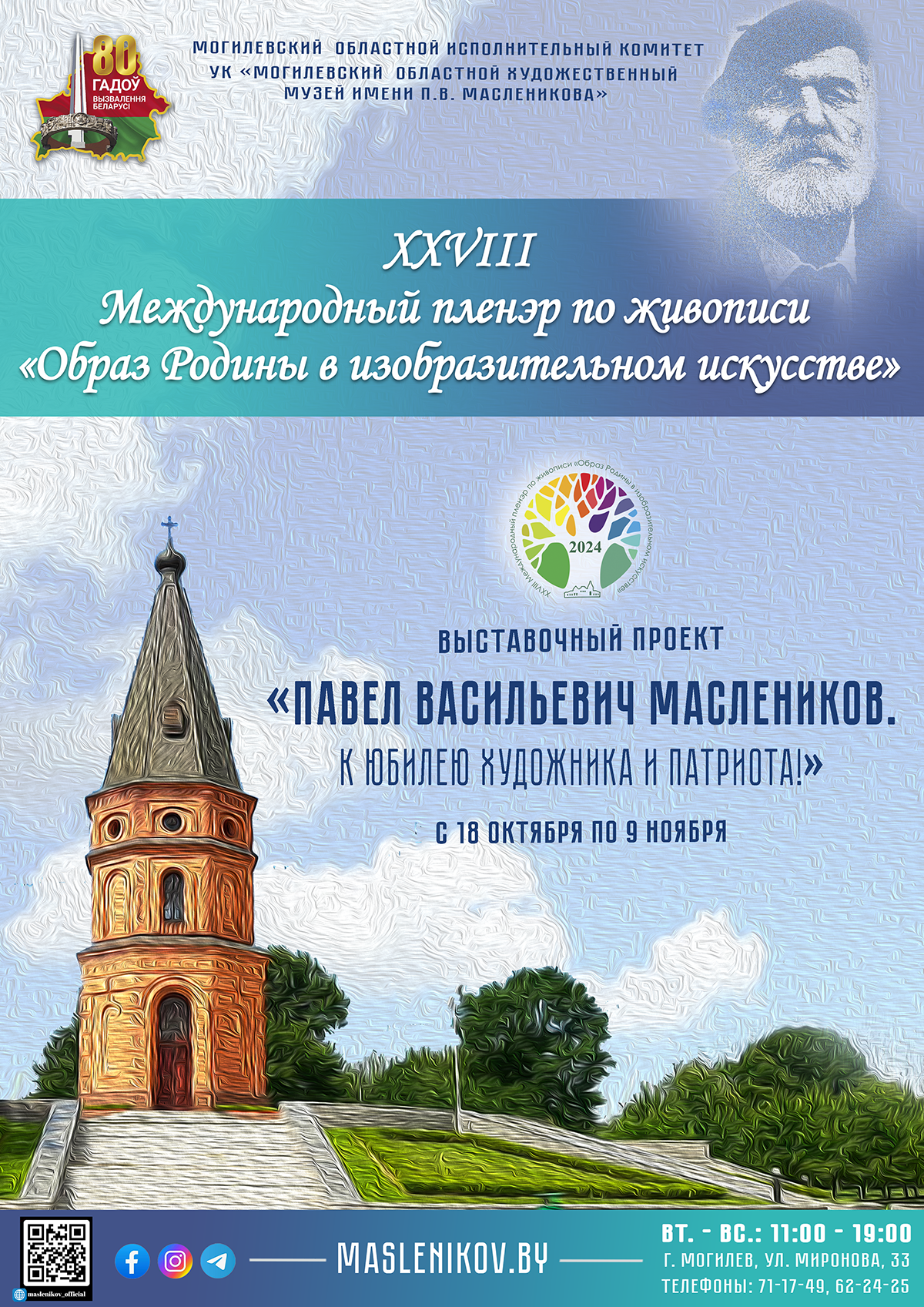 — 2024-й год отмечен знаковой датой — 80-й годовщиной освобождения Республики Беларусь от немецко-фашистских захватчиков. Народный художник Беларуси Павел Маслеников, чье имя носит областной художественный музей, также внес свой вклад в общую Победу. Он являлся не только талантливым живописцем, педагогом и искусствоведом, но и почетным ветераном, настоящим патриотом. Кроме того, в этом году отмечается 110 лет со дня рождения знаменитого земляка, творчество которого способствовало развитию искусства и культуры Беларуси. И девиз пленэра нынешнего года выбран неслучайно — «Павел Васильевич Маслеников. К юбилею художника и патриота!», — рассказали в музее.